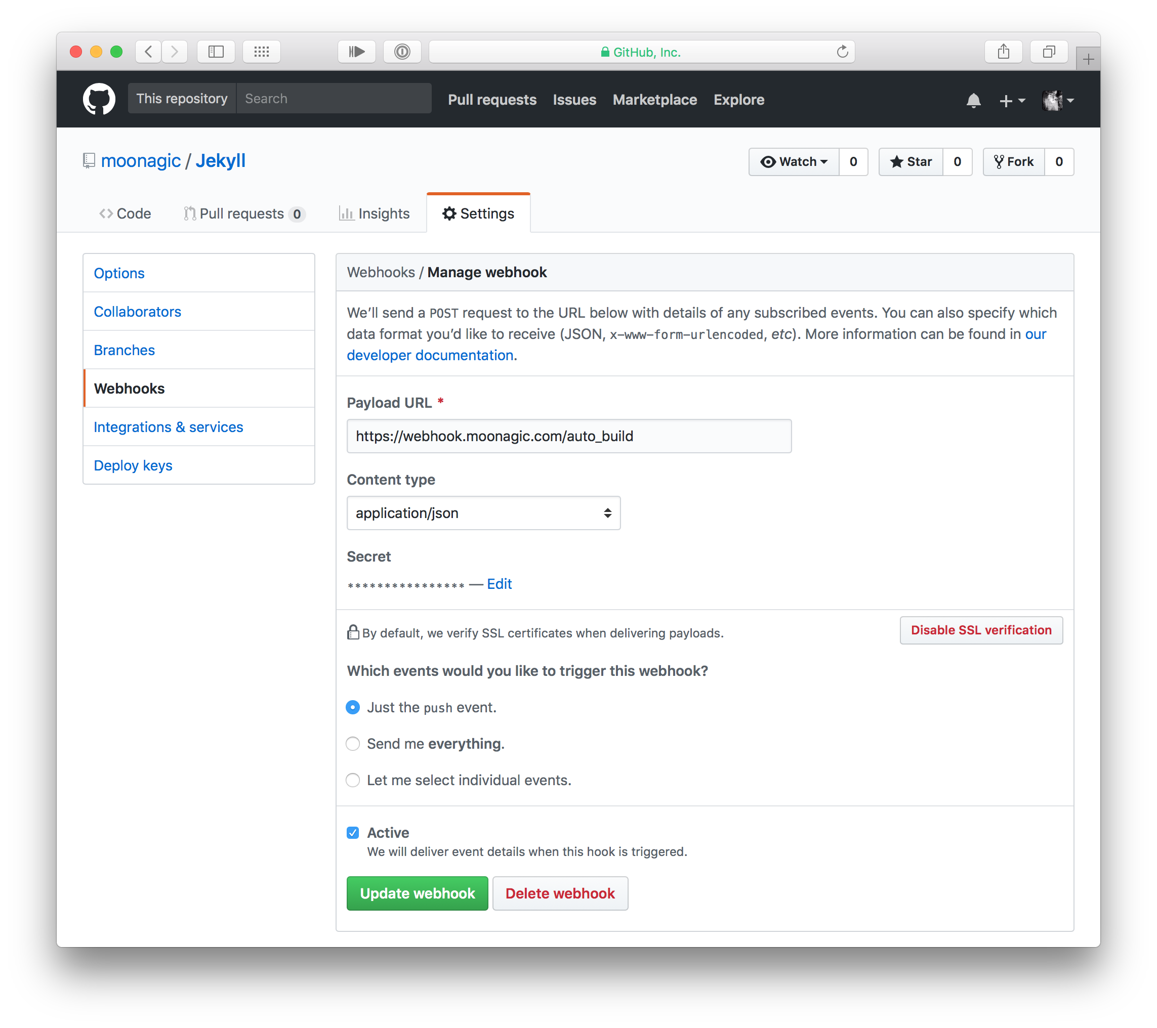 // the secret set in the webhook. var secret = ‘’ // Payload URL set in the webhook. var url = ‘’