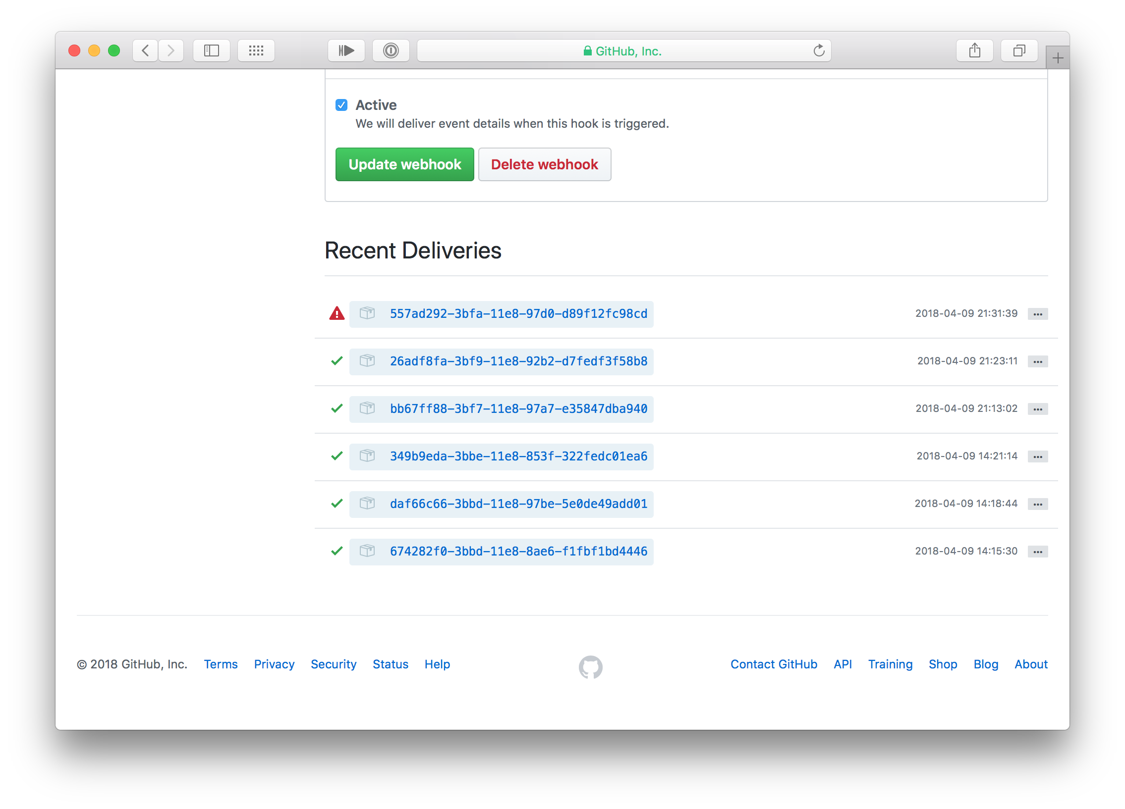 The request that GitHub automatically sends after an event is performed on GitHub as configured in the previous step will be displayed on the webhooks page, as shown in the figure below: